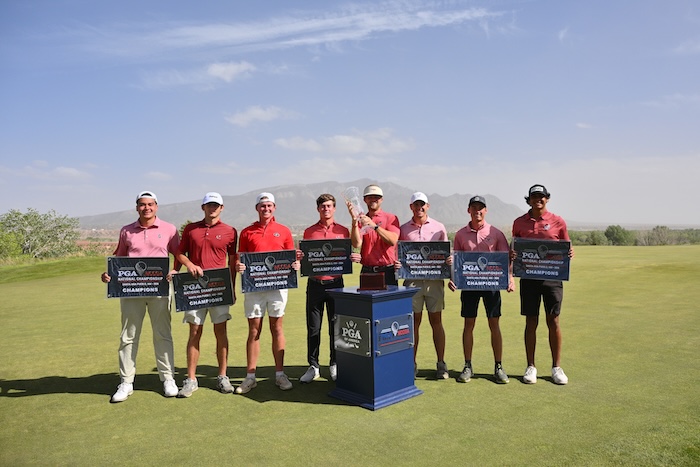 Champion: University of Georgia won the 2026 PGA National Collegiate Club Golf Association Championship at Twin Warriors and Santa Ana Golf Clubs in Santa Ana Pueblo, New Mexico, April 26, 2026. Pictured left to right: Charlie Lamb, Briggs Chmielewski, Emery Langston, William Whitfield, David Spahr, Jimmy Coleman, Braeden Rice, Noah Conner. Photo Courtesy of PGA of America.