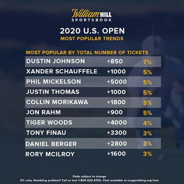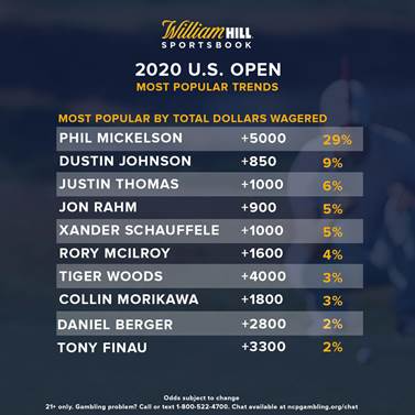Mickelson has brought in 29% of the total dollars wagered to win the 2020 U.S. Open along with 5% of the total number of tickets. Johnson has received 9% of the total dollars wagered and 7% of the total number of tickets, highlighted by another Nevada bettor putting down $3,000 on Johnson 9/1 to net a potential $27,000.
