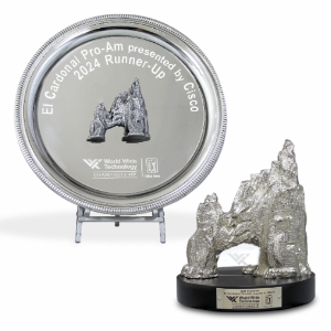 Along with the incredible championship trophy, the World Wide Championship continued to add to their lure with new Pro-Am trophies handcrafted by Malcolm DeMille. The Pro-Am Champions took home 7” tall replicas of the Champion’s trophy. These cast bronze nickel-plated trophies featured a crystal inserted into the arch, and etched with the World Wide Technology logo. The Pro-Am Runner-Ups also took home Malcolm DeMille originals—10” trophy trays featuring a 2D replica of the Arch of Cabo San Lucas trophy and engraving with the tournament’s logo.